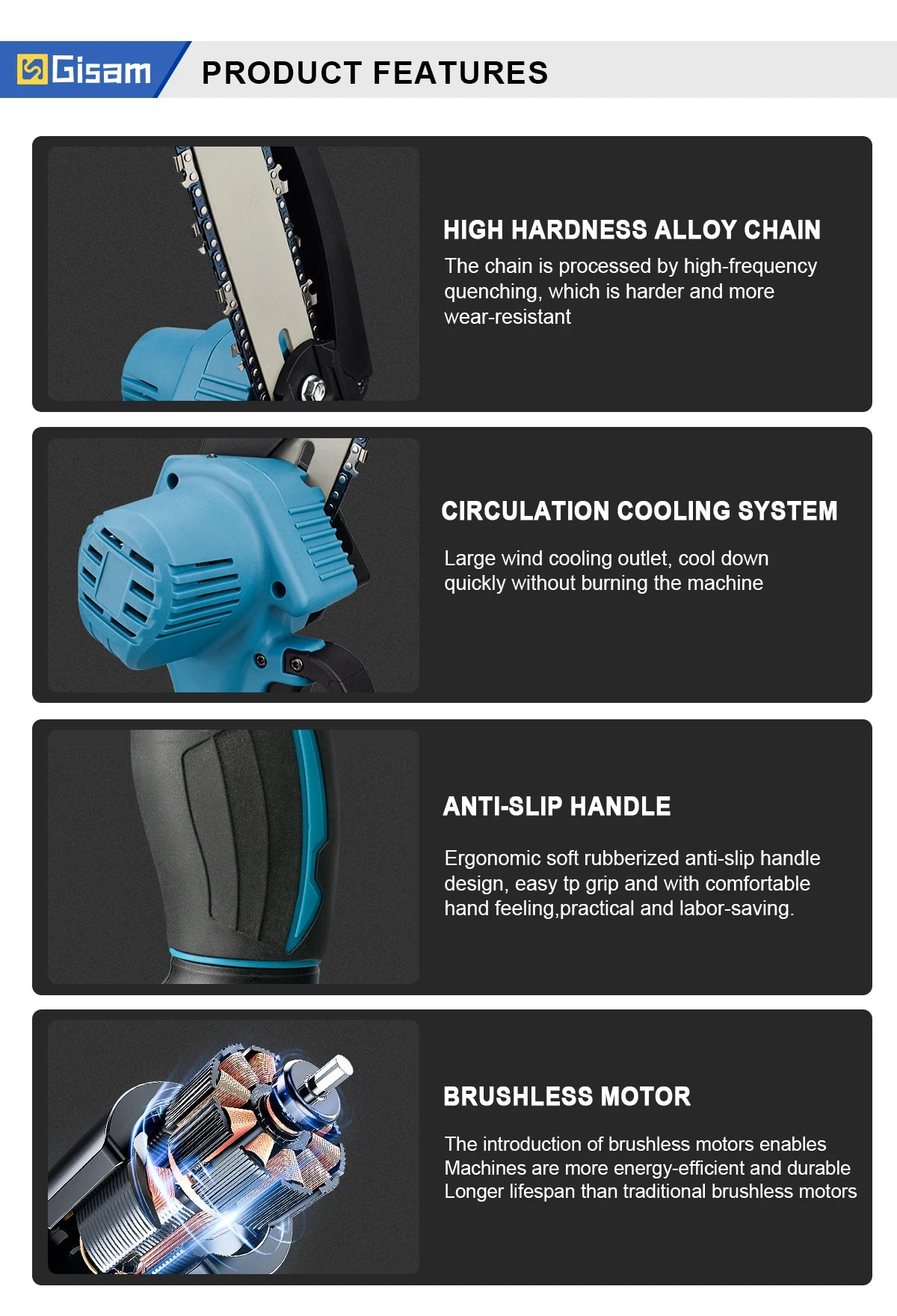 -Brushless motor, strong power, fast cutting speed, improve efficiency.