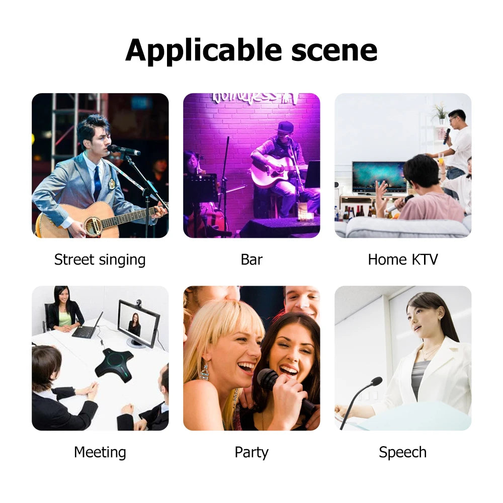 5. Extensive Compatibility:PA, mixers, speakers, amplifiers and karaoke machines with 6.35mm (1/4") mic input, iPhone or Android smartphones, tablet, laptops with the 3.5mm adapter.
