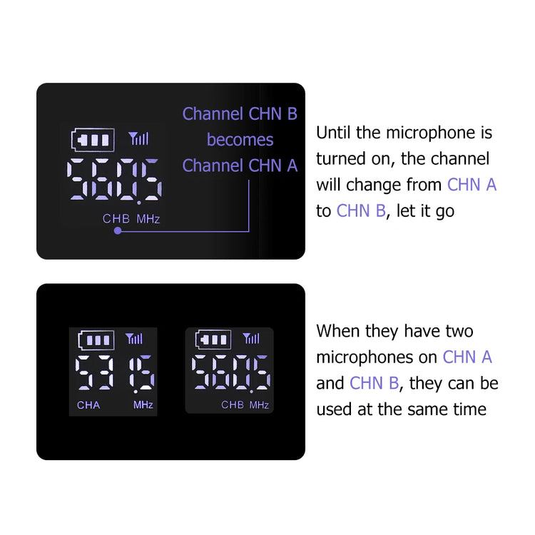 Turn off the microphone, press and hold the microphone switch for 7 seconds, until the microphone is turned on, the channel will change from CHN A to CHN B, let it go.