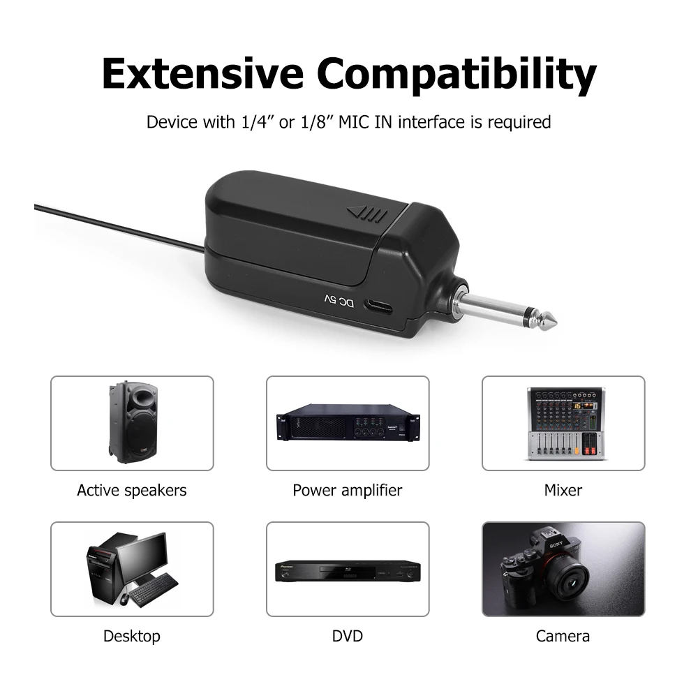 6. Easy to Use : Plug and Play, Plug the mini receiver into the mic socket of any powered speaker, mixer, amplifier, digital recorder or some DLSR cameras for audio output, power on the mini receiver and microphone, it is ready to go, Easy to use.