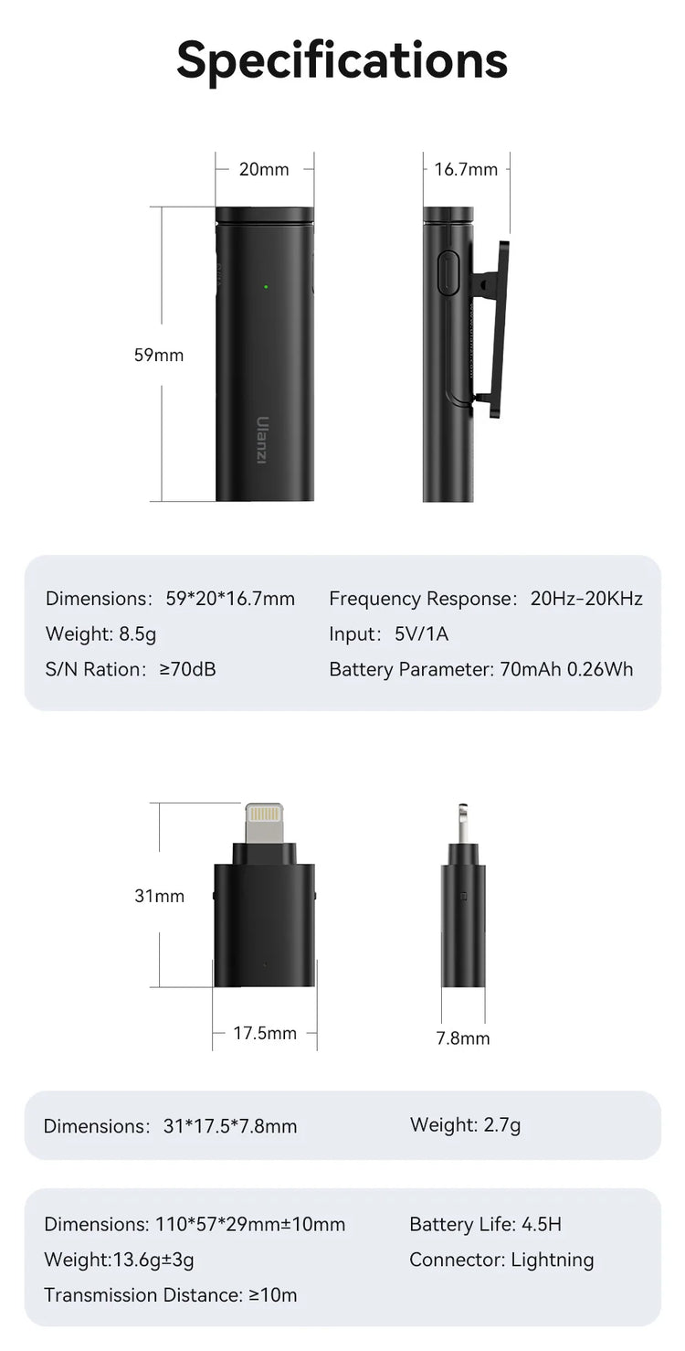 Ulanzi WM-10 Wireless Clip-on Microphone Lightning Connector