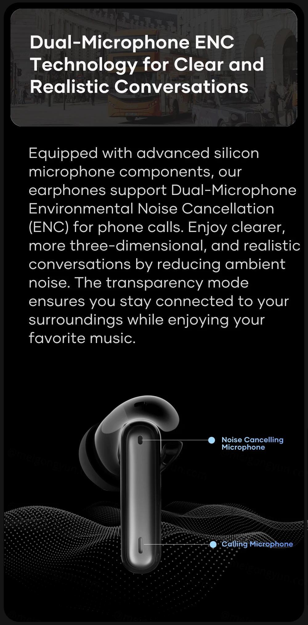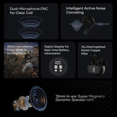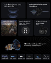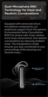 Equipped with advanced silicon microphone components, our earphones support Dual-Microphone Environmental Noise Cancellation (ENC) for phone calls. Enjoy clearer, more three-dimensional, and realistic conversations by reducing ambient noise. The transparency mode ensures you stay connected to your surroundings while enjoying your favorite music.