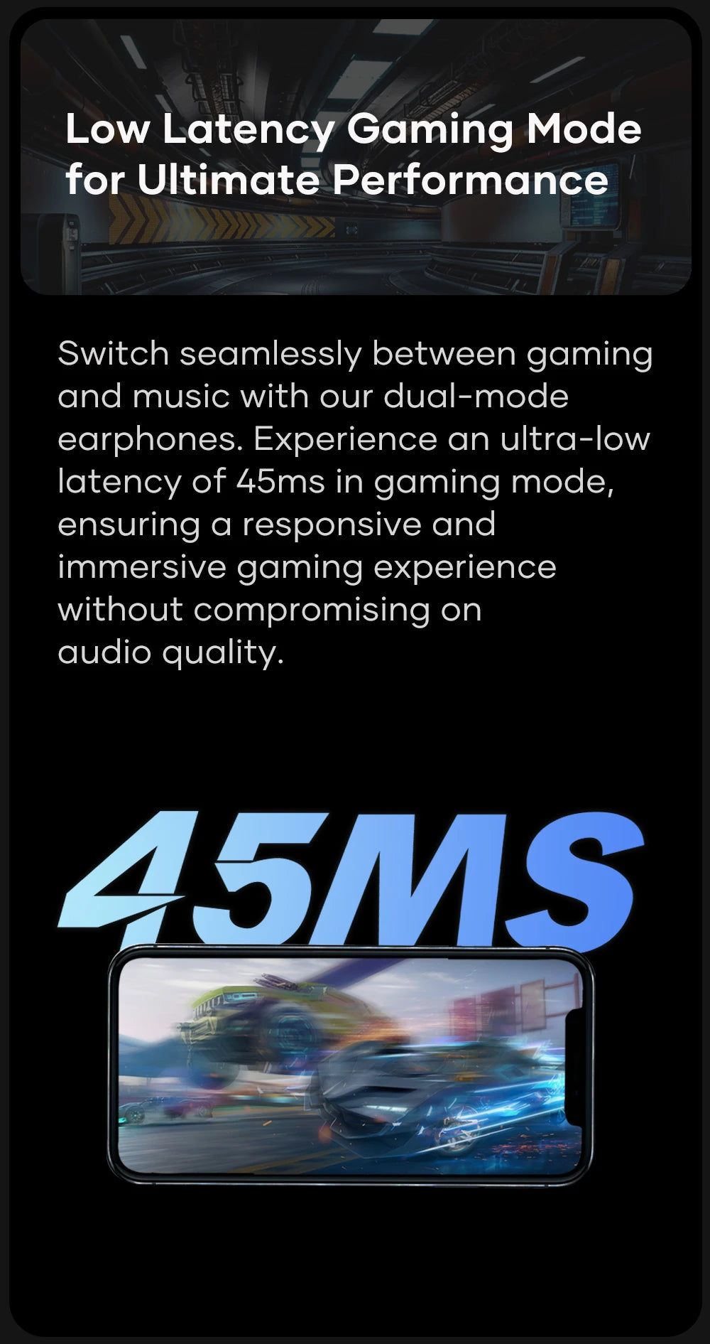 Switch seamlessly between gaming and music with our dual-mode earphones. Experience an ultra-low latency of 45ms in gaming mode, ensuring a responsive and immersive gaming experience without compromising on audio quality.