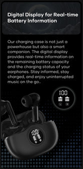 Our charging case is not just a powerhouse but also a smart companion. The digital display provides real-time information on the remaining battery capacity and the charging status of your earphones. Stay informed, stay charged, and enjoy uninterrupted music on the go.