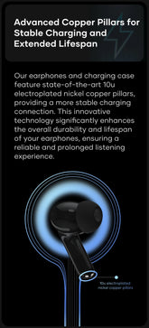 Our earphones and charging case feature state-of-the-art 10u electroplated nickel copper pillars, providing a more stable charging connection. This innovative technology significantly enhances the overall durability and lifespan of your earphones, ensuring a reliable and prolonged listening experience.
