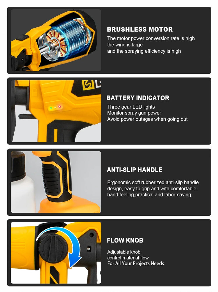 Adjustable flow control - Regulate your paint output by adjusting the flow control knob on the sprayer to get different paint output, suitable for edges, corners and broad interior surfaces of various work and DIY projects