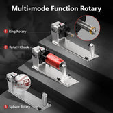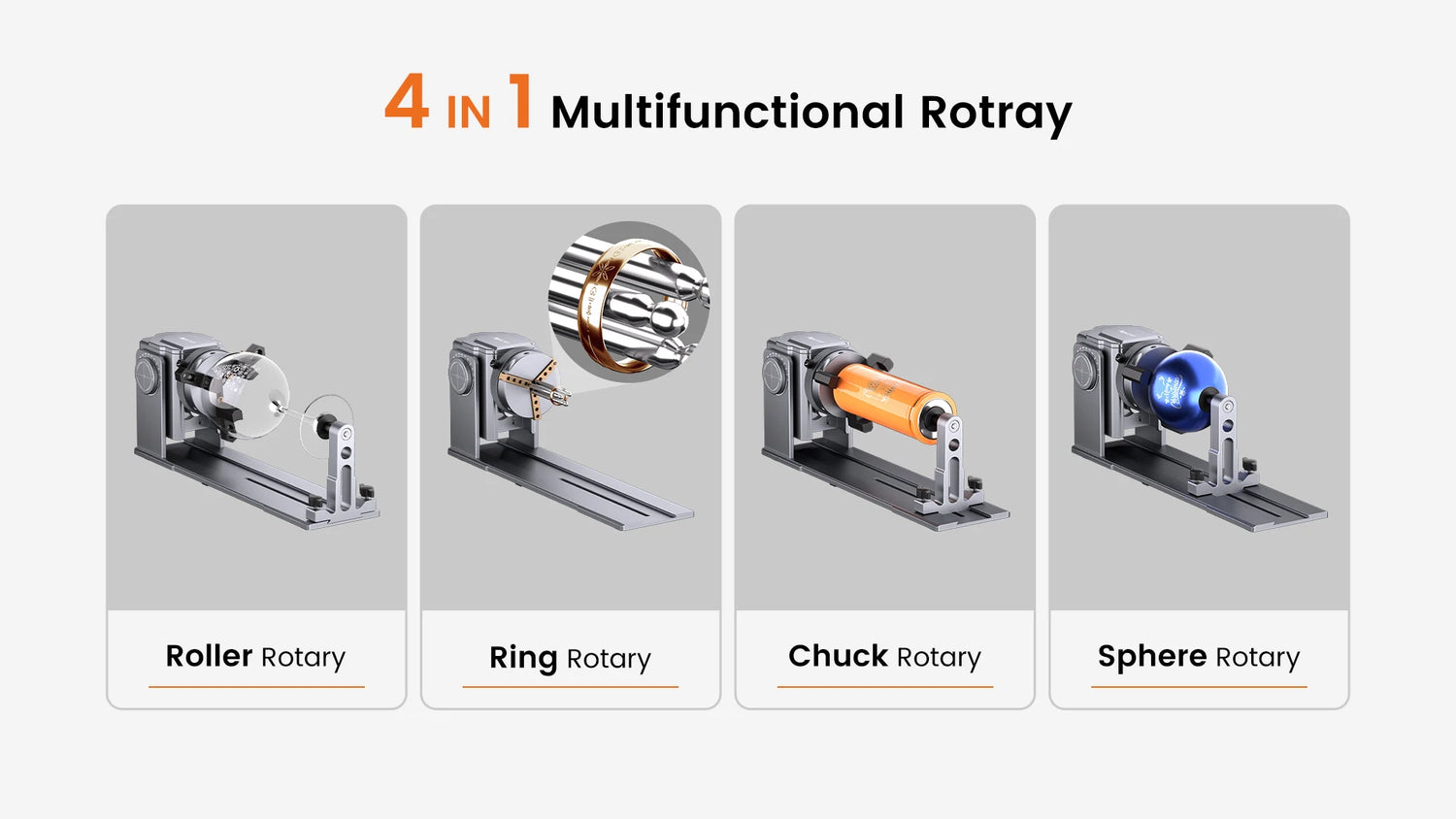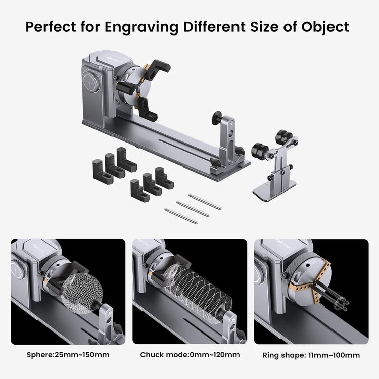 including Roller Rotary, Chuck Rotary, Sphere-Engraving Module and Ring-Engraving Stud. You can unleash your creativity on almost all cylinders by changing accessories, such as wine glass, yeti tumbler, baseball bat, ring, ball, or mug with handle
