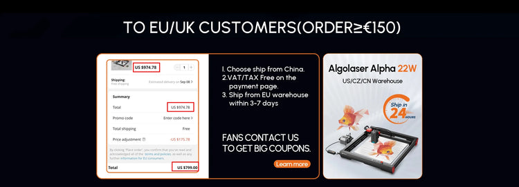 Welcome to AlgoLaser Manufacturing Store, we dedicated to offering you laser engraving machines with Easy Operation,Fast Delivery, Reliable Quality and Affordable Price.  We have lots of inventory in Russian, Czech republic, Spain, United States, Mexico, Brazil and China warehouse, about 3-7 Business Days Fast & Free Shipping. And we are original Ortur manufacturer in China, you could rely on us for the consistent quality and service!