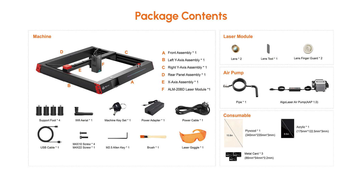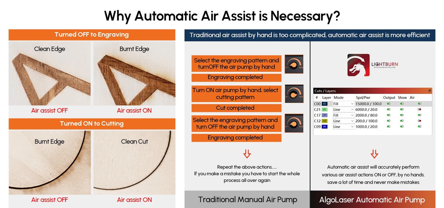 Built-In Air Hose: AlgoLaser Alpha connect the free Air Pump to have full control on your Air Source.
