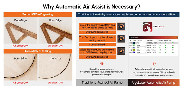 3.【Upgraded Laser Engraving with Air Assist System】The Delta 22W comes with an automatic air pump 30L/min in the package, realize automatic air assist control in Lightburn. Keeps edges clean and smooth.