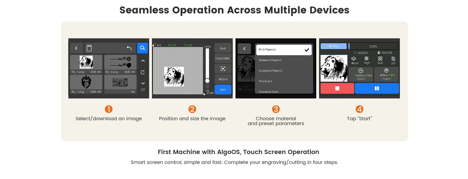 With movement precision within 0.01 mm, Algolaser speeds up the engraving and cutting process, improves efficiency by 40%–80% compared to other models, and lets users quickly obtain their finished product.
