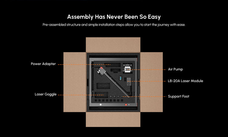 The Alpha 20W comes with an automatic air pump 30L/min in the package, it works with 32-bit dual core air assist motherboard to realize automatic air assist control. It improves the efficiency of the engraving process and results by 200%, shortens the engraving time, and reduces the The yellow fringing caused by the smoke, extend the lifespan of the laser module.