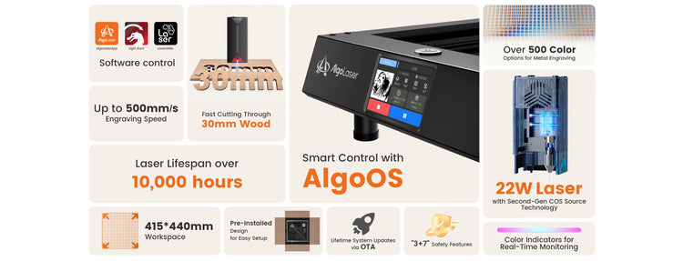 Algolaser Alpha 22W Craft Laser Cutter Engraver Smarter Touch Screen with Rotary & Air Pump for Craft Making Wood/PVC/Metal/MD