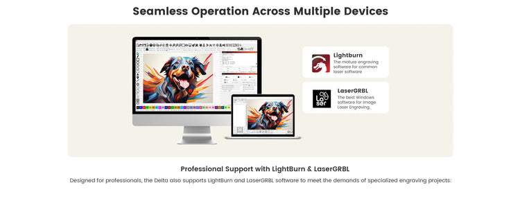 Through internal firmware optimization, Algolaser Delta 22W can directly use market-mature software like Lightburn and LaserGRBL, compared with G-code Cluster Enabled, which needs complex reflash step to use open source program, Delta for professional engravers or those who need to achieve richer and more diverse engraving requirements, Means their operation steps are simplified, and the operation difficulty and time cost are reduced, just plug and play; of course, if you are beginner, this machine also supports the ourself-developed native program, which is easy to use and for free in whole life