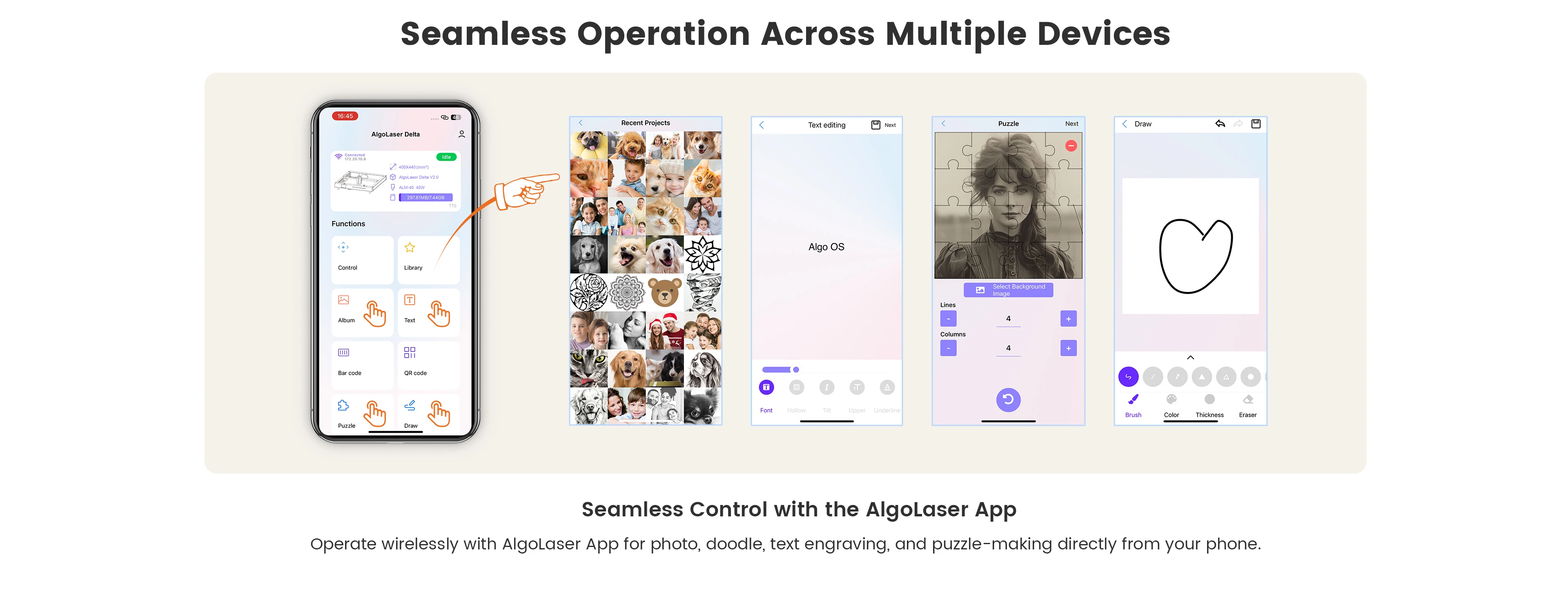 Algolaser machines have built-in Wi-Fi connectivity as well as standard 32GB TF card compatibility. The Algolaser team developed the Algolaser Laser app to take full advantage of these functions, allowing creators to use the mobile app to create new works remotely. This makes it easier for novices to operate the Delta 22W and enables creativity without limiting users to one place.
