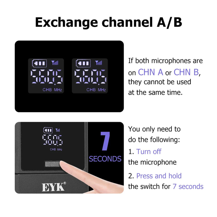 Turn off the microphone, press and hold the microphone switch for 7 seconds, until the microphone is turned on, the channel will change from CHN A to CHN B, let it go.