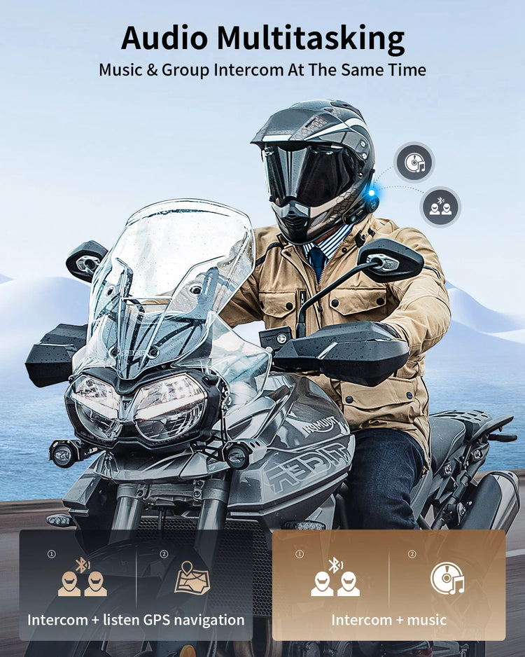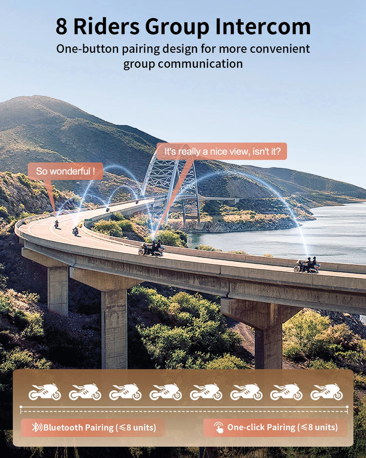 Intercom distance can reach 500 meters (for two riders), 2000 meters (for 10 Riders)