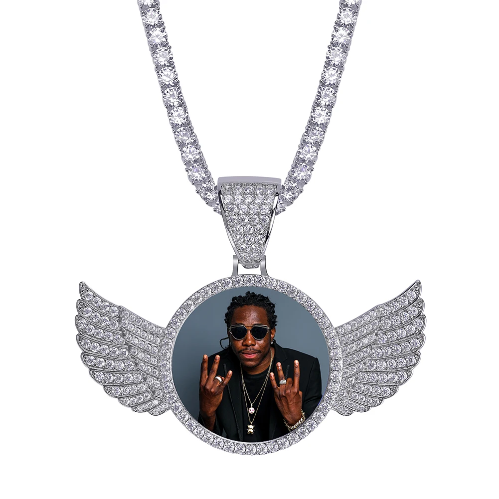 GUCY Custom Made Photo With Sngel Wings Necklace & Pendant 4mm Tennis Chain Cubic Zircon Men's Hip Hop Jewelry