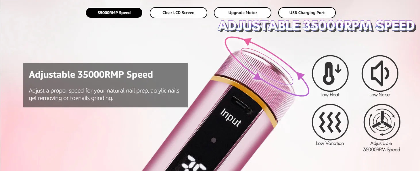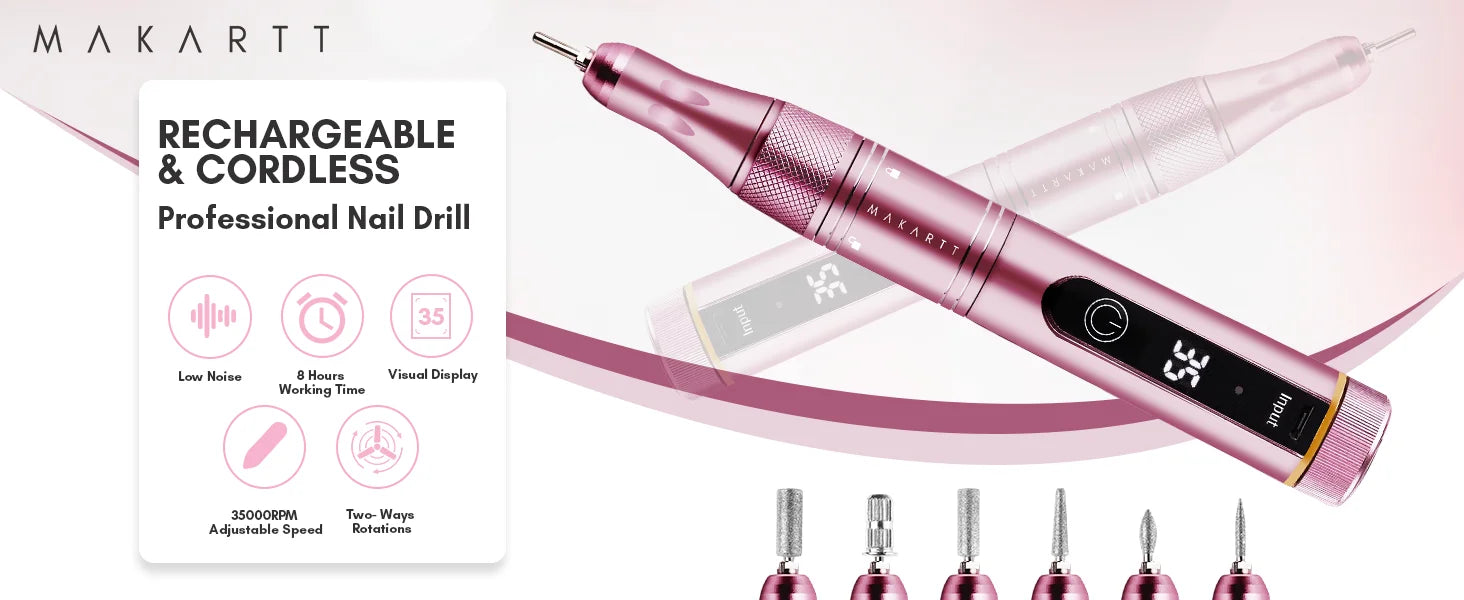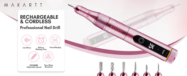 Makartt ELLSEE Wireless Nail Drill Kit: Adjustable high speed 0-35000RPM, this nail drill machine meet almost all your needed for nail art work: polishing natural nails, cleaning cuticle and removing acrylic nails, dip powder, poly nail gel, etc. It is low noise, low heat and low vibration with the upgrade motor. Perfect for the professional nail technician and beginner DIY use.