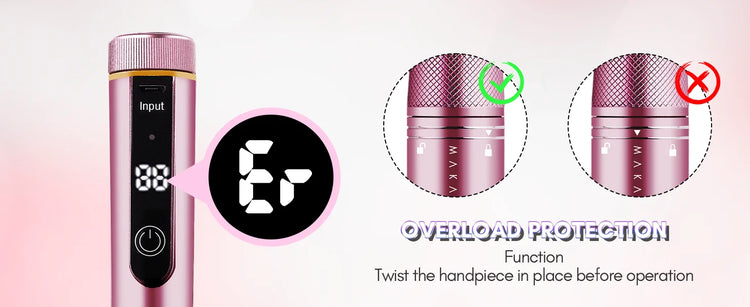 Hand piece will stop working and LCD screen will display "Er" mode when the overload protection function is started to avoid overheating due to improper operation. Please turn off the power and check if the nail hand piece in a proper operation.