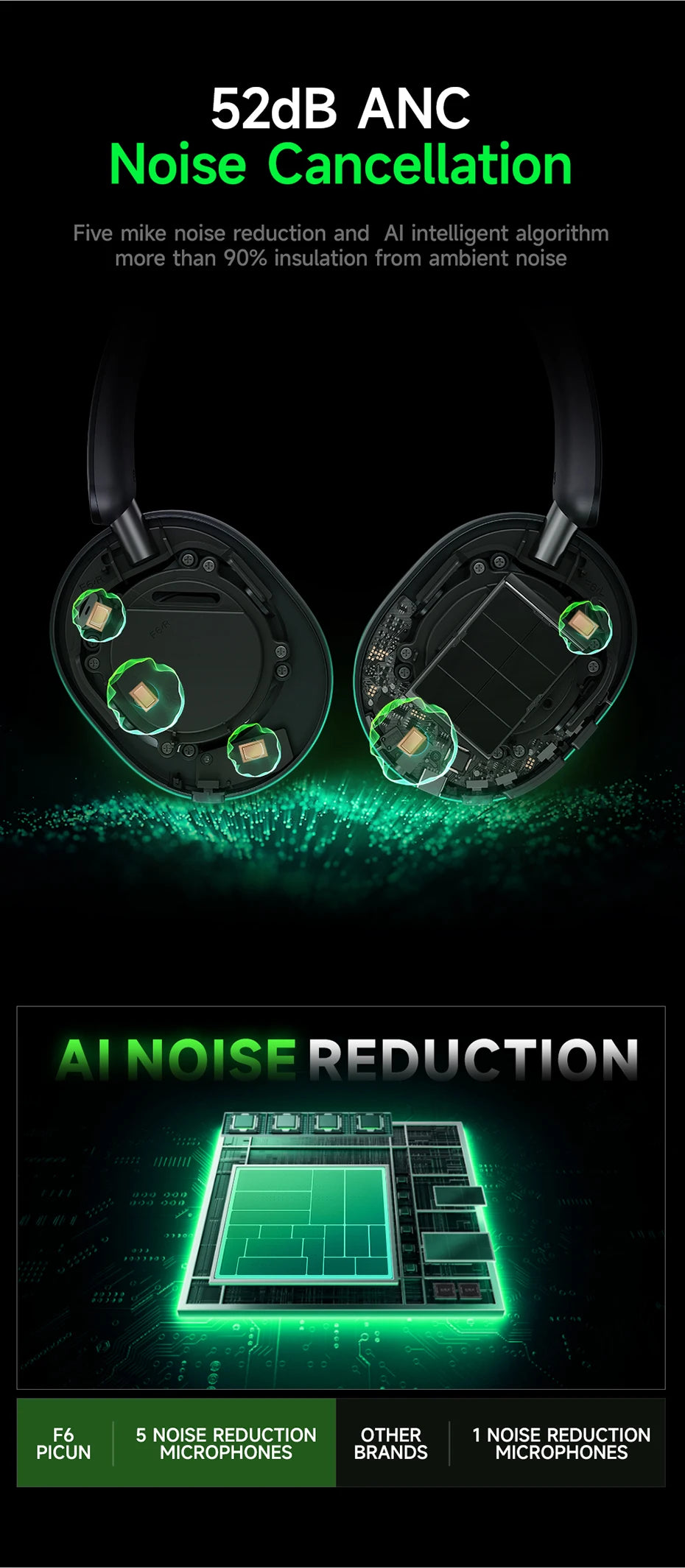 Most Noise-Cancelling Headphones on the Market Have Two Noise-Cancelling Microphones, While the International Leading Brand (Sxxy) Has Seven Noise-Cancelling Microphones, And Ours Has Five . The Noise Reduction Effect of F6 Can Reach 80%-90% of That of International Head Brands.