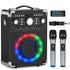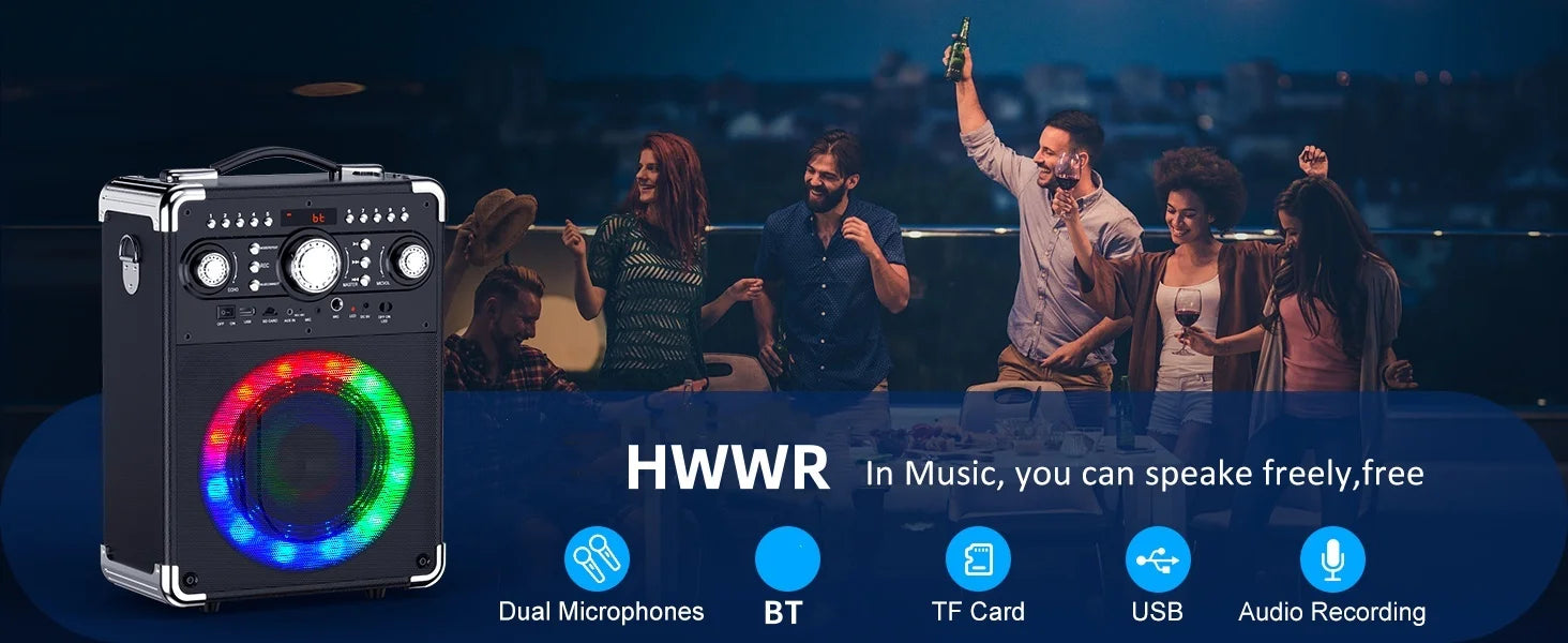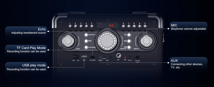 All-in-One Karaoke : Unleash your inner rockstar with this versatile karaoke machine! Featuring a built-in speaker, 3 wireless microphones for duets, easy-to-use controls, and vibrant LED lights. 6-in-1 Wireless Connectivity Bluetooth 5.1, USB/TF/AUX ports, FM radio, and 3 wireless mics. Perfect for karaoke, parties or outdoor camping