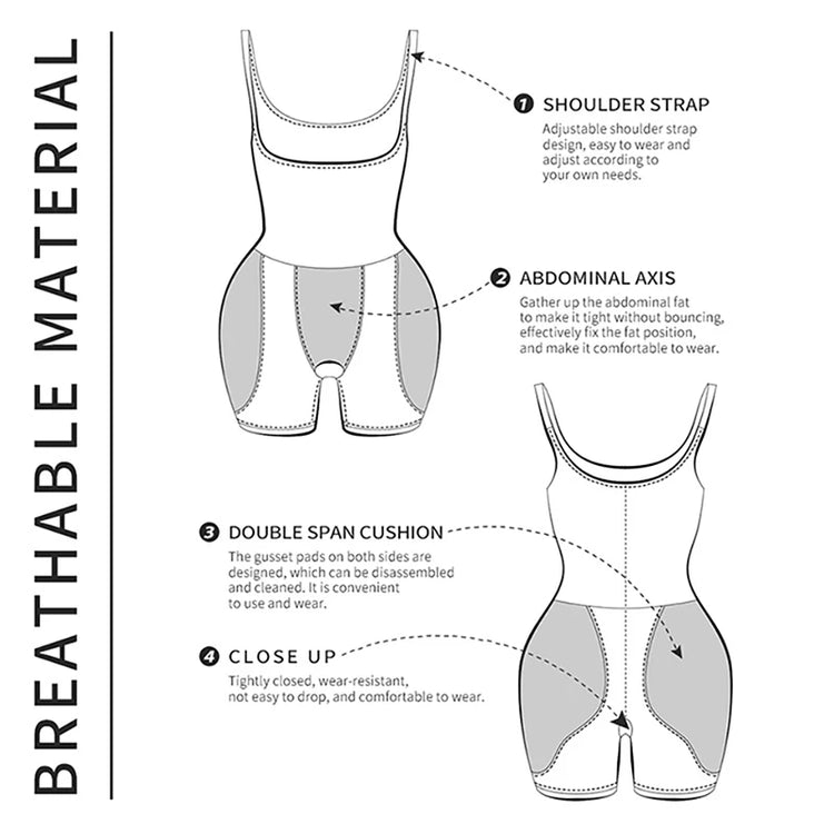 ♥[More Ccomfortable & Heathy Shaping] Long thigh design keeps thigh flat and breathable. The thigh compression design ensures this mid-thigh slimmer will not roll down or up. U-shape open bust shapewear pushes up your breast and makes your chest more erect. Anti-skid double adjustable shoulder straps prevent slipping, rolling, and bunching, provide your shoulders maximum comfort.OPEN CROTCH DESIGN — Wear panties over bodysuits so you do not need to take it off for ease when nature calls.